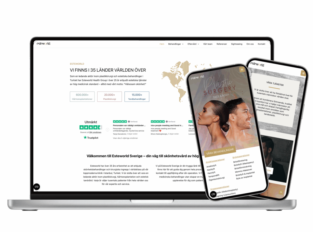 Vi skapade en ny modern webbplats åt Esteworld med fokus på både design och funktionalitet. Genom en noggrann analys utvecklade vi en långsiktig SEO-strategi för att öka synligheten och locka fler besökare. Samtidigt införde vi en systematik för regelbundna uppdateringar av innehåll och användarupplevelse, vilket gradvis höjer konverteringsgraden.